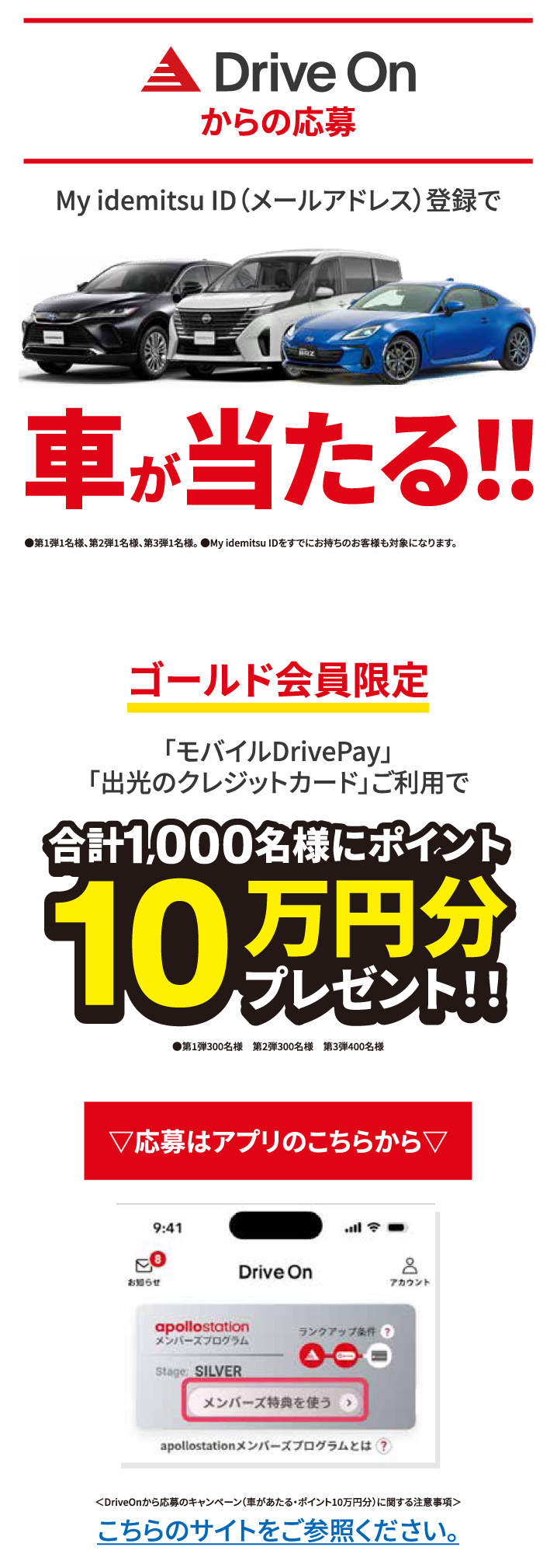 DriveOnから応募のキャンペーン(車があたる・ポイント10万円分)に関する注意事項